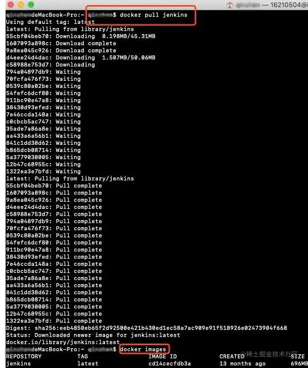点击进入镜像,会有很多相关文档,右边有安装的命令“docker pull jenkins”,将命令复制到终端执行即可自动下载安装Jenkins的官方镜像了