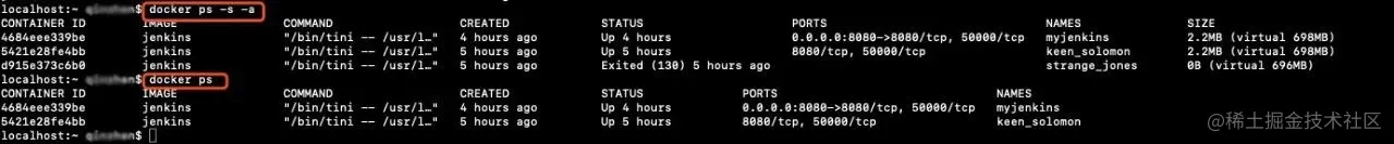 使用docker ps可查看当前运行的所有容器(docker ps -s -a 可查看包括已经退出的和SIZE)