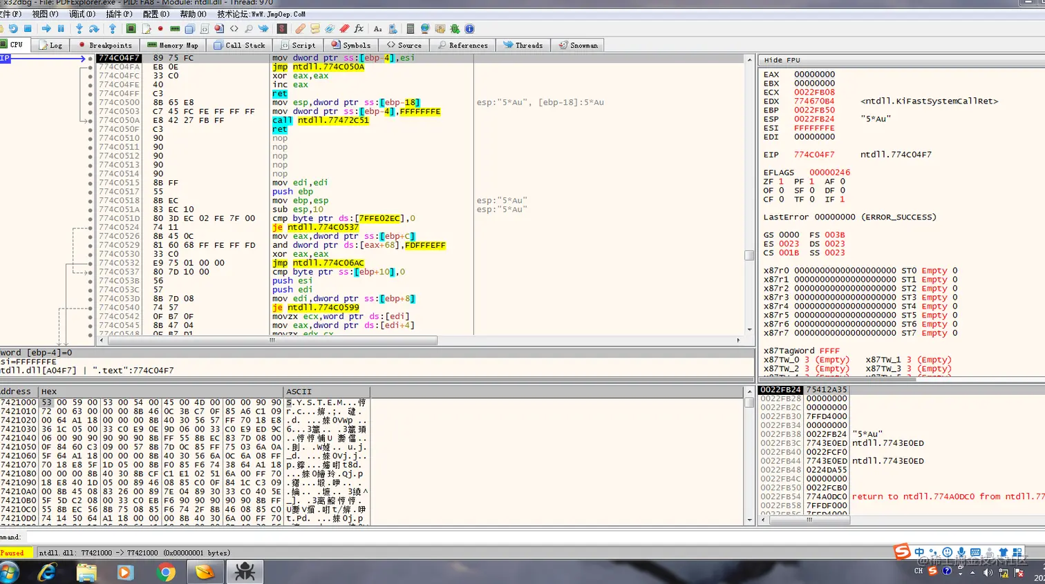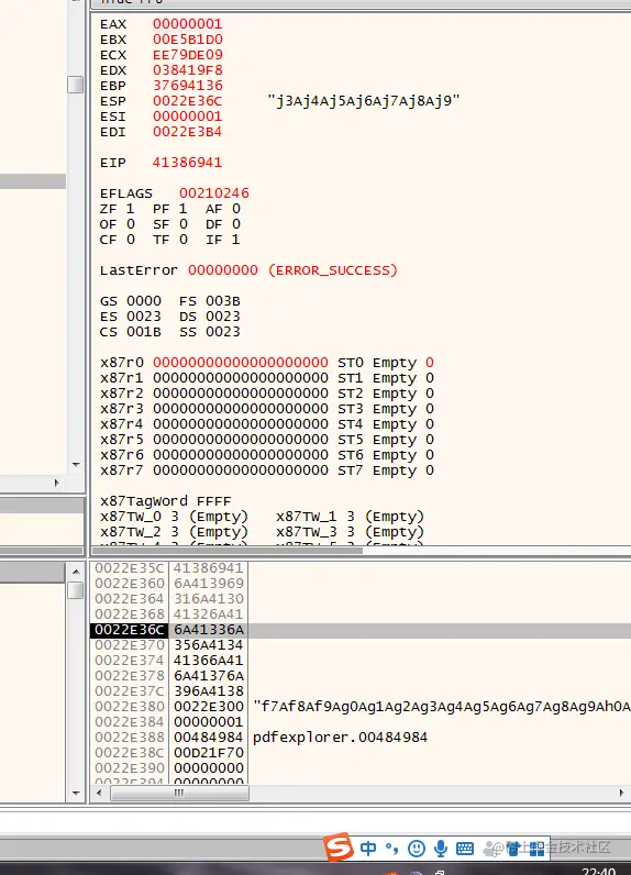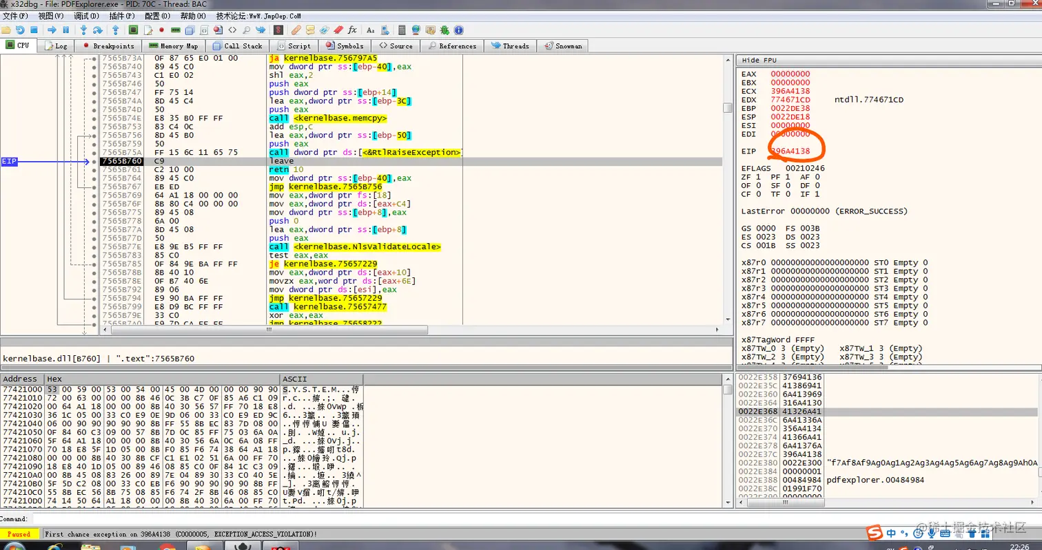 复制粘贴上文字符串,使用x32dbg打开PDF Explorer,运行:
