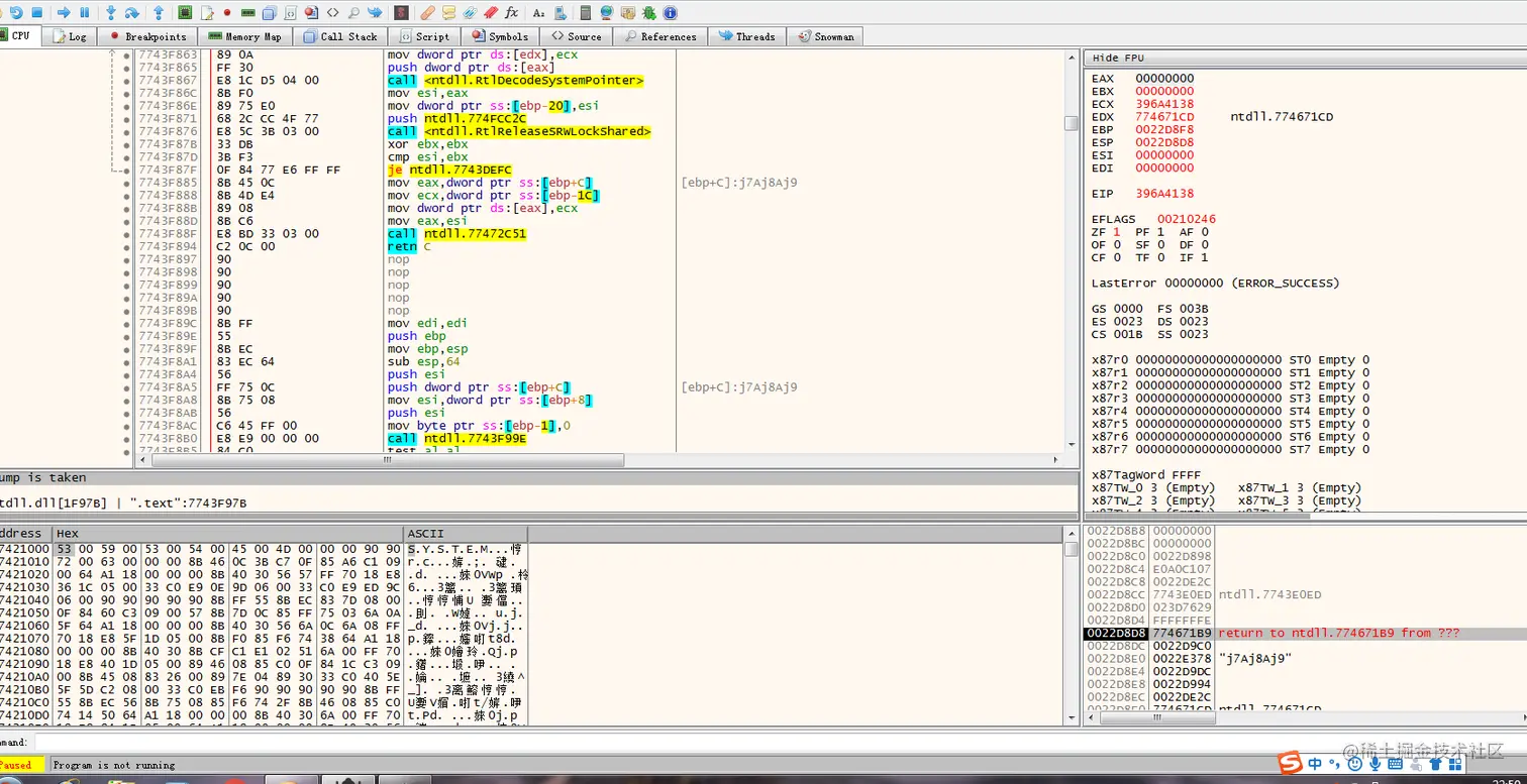 观察x32dbg,按一下F9,让程序跑,观察EIP,找到溢出点: