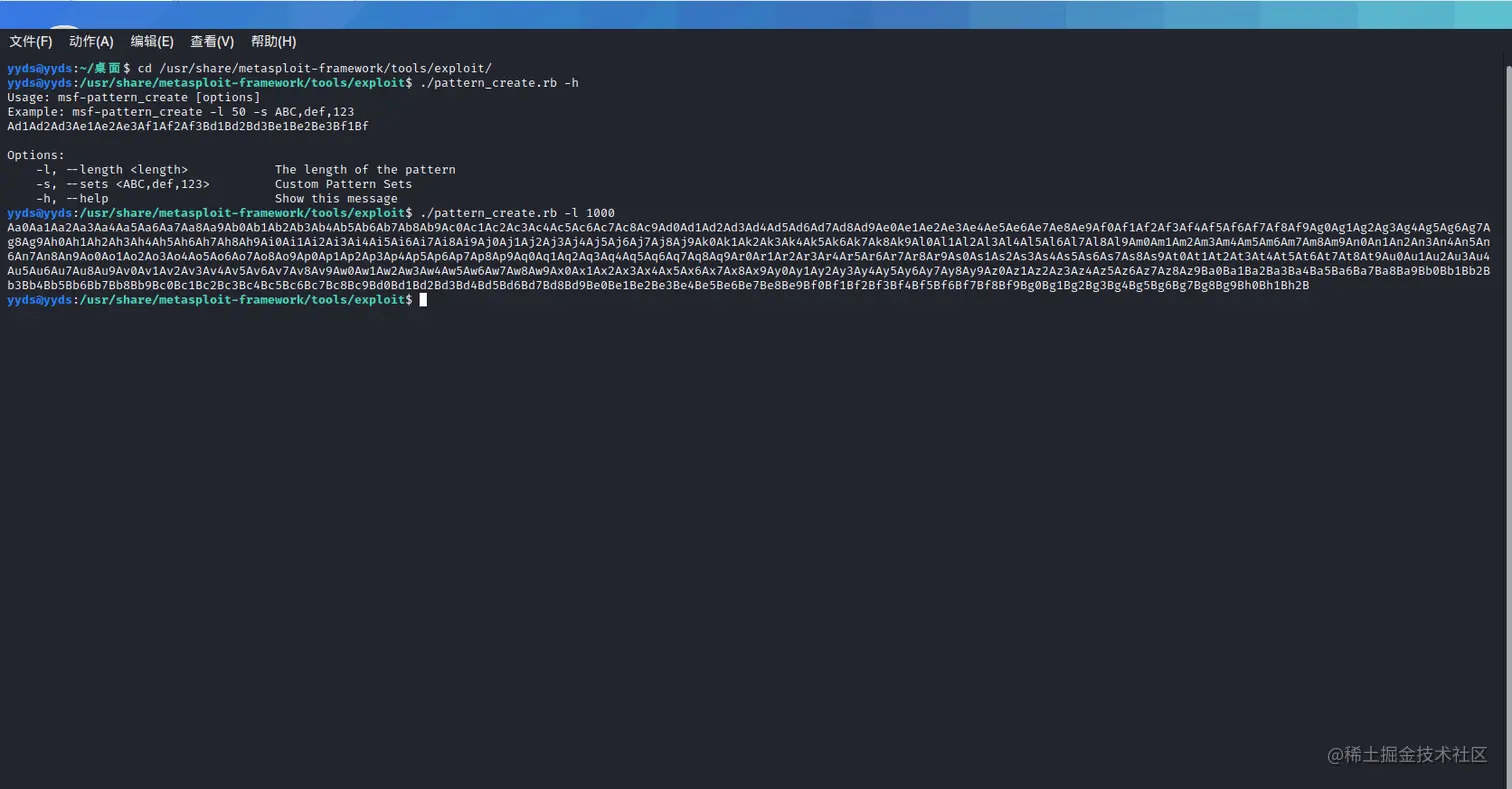 整奔溃了,咱利用kali中pattern_create生成字符串,用来定位溢出点: