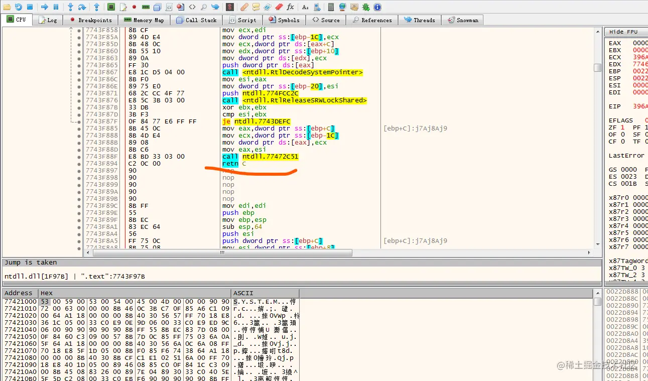 如果在这里我们上下找一下,确实可以找到一个ret c,哈哈哈,下断点测试一下确实是这里: