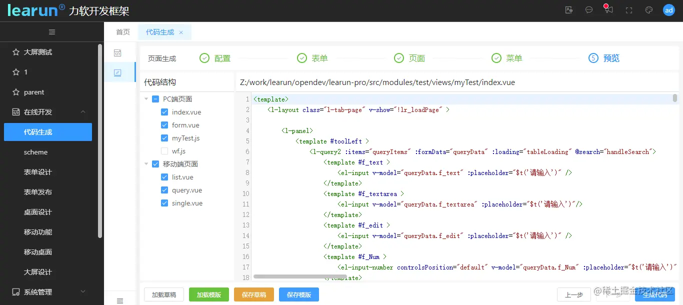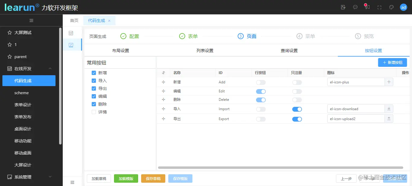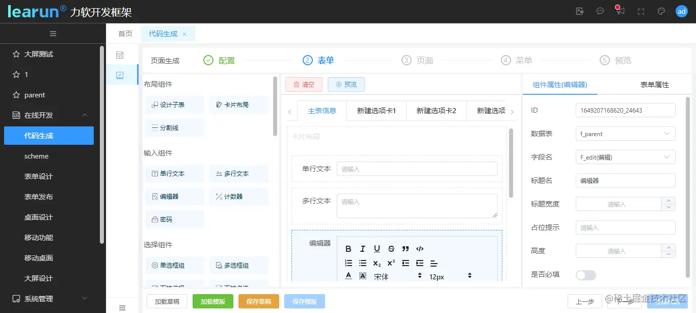 如需生成前端代码,则进入页面代码生成模块,填写功能名称、模块等信息,并与后端生成时的配置保持相对应。同时LeaRun还提供了保存草稿和保存模板的功能,方便在设置复杂表单的时候中途可以保存设置退出。