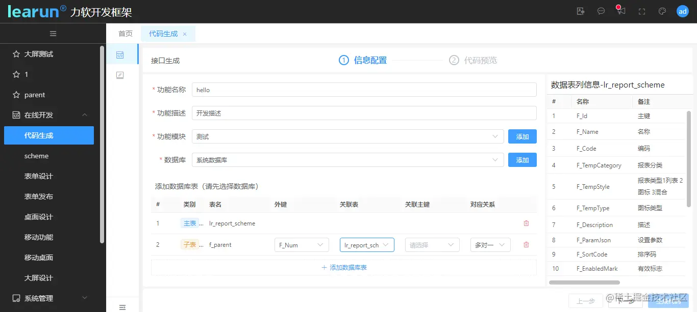 LeaRun.net代码生成器界面简洁易懂,分为后端的接口代码生成和前端的页面代码生成两类。如需生成后端代码,进入接口代码生成页面后,填入基础信息,并添加数据库表。多表的话,还需要选择子表,并设置对应关系和对应字段。