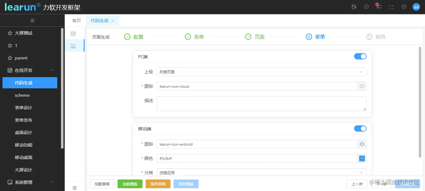 点击[下一步]填写相应的菜单发布信息,勾选是否生成 PC 端前端或移动端的代码。