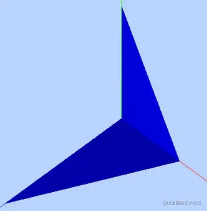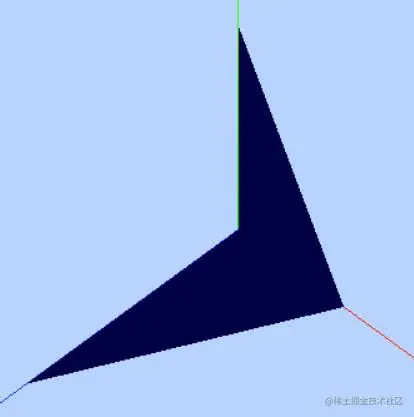 下面代码仅仅定义了几何体BufferGeometry的顶点位置数据,没有定义顶点法向量数据。没有法向量数据,点光源、平行光等带有方向性的光源不会起作用,三角形平面整个渲染效果相对暗淡,而且两个三角形分界位置没有棱角感。