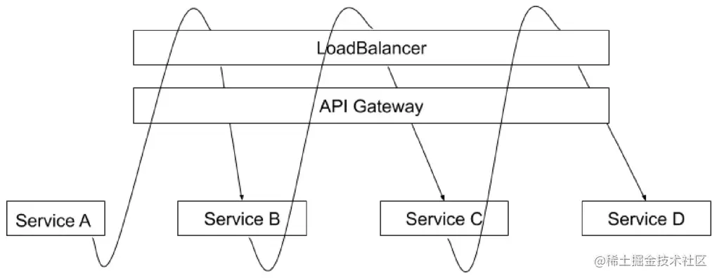 微服务和微服务之间有调用关系,所有调用关系都经过API网关,最终的调用链如图1所示。基于API 网关的数据转发如图1所示,展示了4个微服务之间的3次调用,可以看出任何服务到服务之间的调用都要从调用方通过负载均衡器到API网关再到目标服务。那么如何优化部署以减少对API网关的依赖呢?答案是,使用服务网格。