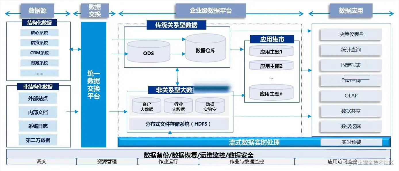 例如下图,银行业务系统中的数据,由统一数据交换平台进行流转分发给传统关系型数据库和非关系型大数据平台,数据仓库和大数据平台汇总后,交流各个应用集市分析使用。其中涉及大量的数据处理和数据交换工作: