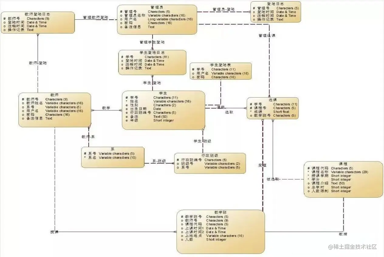 如下图中某学校学生管理系统后台数据库的ER图示例,学生的学号、姓名、性别、出生日期、年级、班级等字段组成了学生信息表,学生信息表、教师信息表、选课表之间通过一个或多个关联字段组成了整个学生管理系统后台的数据库。