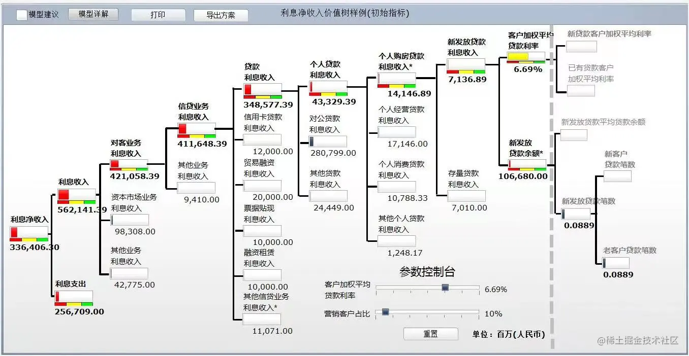 以某银行财务指标为例,利息净收入的计算公式为利息收入减去利息支出,而利息收入又可以拆分为对客业务利息收入、资本市场业务利息收入和其他业务利息收入,对客业务利息收入又可以细分为信贷业务利息收入和其他业务利息收入,信贷业务利息收入还可以细分为多个业务条线和业务板块的利息收入。