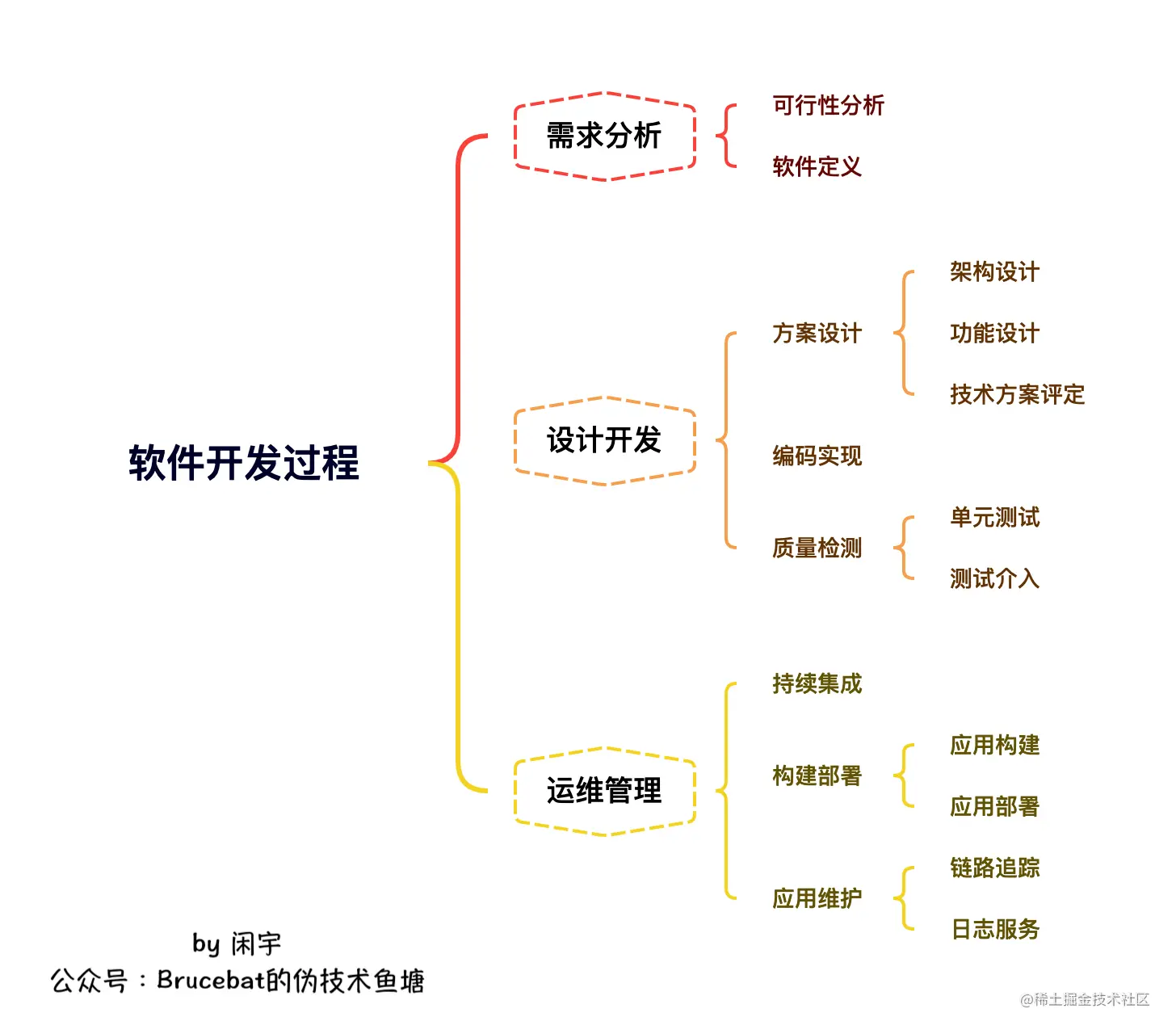这里要说明两点:第一,由于闲宇编程使用的主语言是Java,所以在进行介绍时会基于Java语言的生态进行讲解,其他语言的同学可以跳过Java相关的内容;第二,由于闲宇也只是一个刚刚从业数年的小开发,马马虎虎可以算是达到了“初窥门径”与“登堂入室”之间的程度,对于软件开发过程的理解仍存在不少谬误和缺漏,所以对于本系列的定位只是将其作为知识体系构建的导引,而非对每个软件开发环节的实现细节进行详实说明,当然闲宇也会尝试对每一个环节进行深挖,尽力保证每个环节涉及的细节都能够提及。在这一过程中大家也可以提出自己的修改意见,闲宇希望能够与大家共同完成这一系列的创作。
