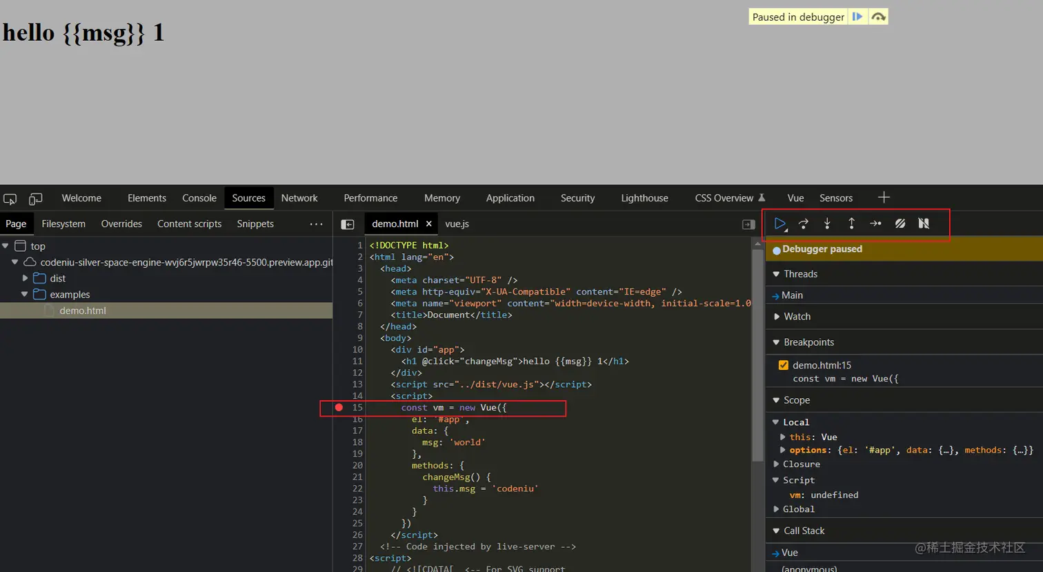 使用浏览器的调试工具在 new Vue() 这行打上断点,开始调试: