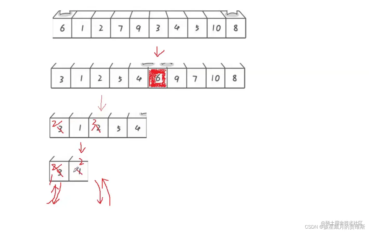 另外,快速排序过程中的关键词相同的元素在排序前后相对位置发生了改变,因此,快速排序是不稳定的排序算法。