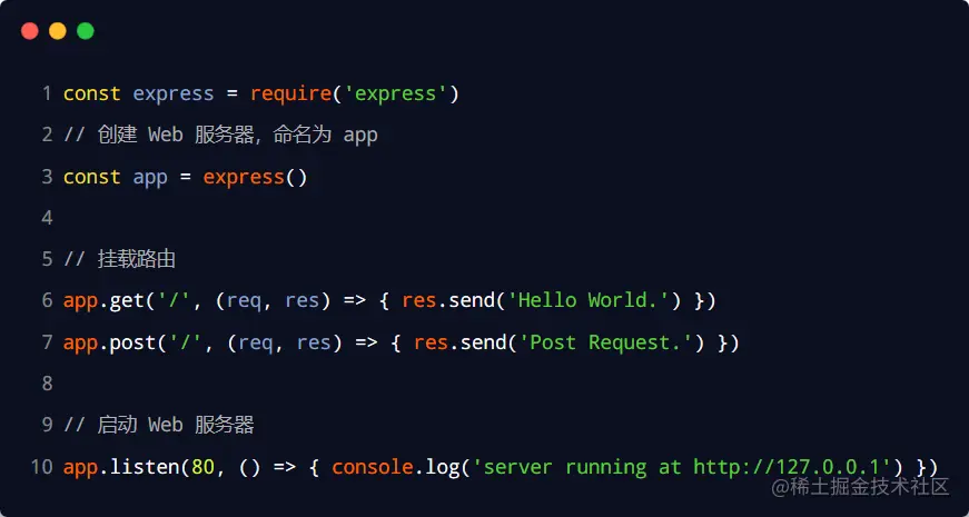 在 Express 中使用路由最简单的方式,就是把路由挂载到 app 上,示例代码如下: