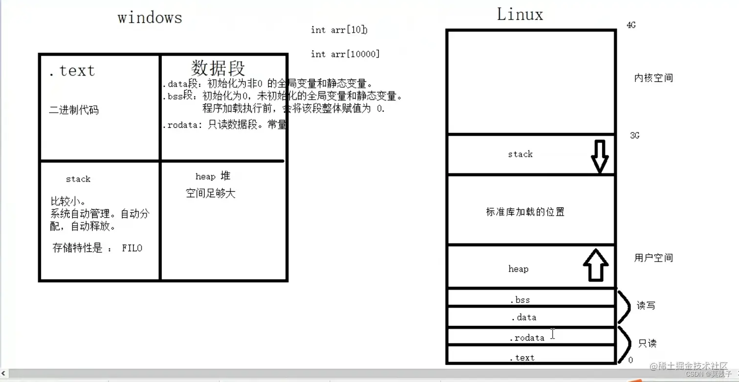 堆是一个大容器,它的容量要远远大于栈,但没有栈那样先进后出的顺序。用于动态内存分配。堆在内存中位于BSS区和栈区之间。一般由程序员分配和释放,若程序员不释放,程序结束时由操作系统回收。