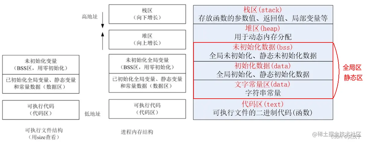 程序没有加载到内存前,可执行程序内部已经分好3段信息,分别为代码区(text)、数据区(data)和未初始化数据区(bss)3 个部分(有些人直接把data和bss合起来叫做静态区或全局区)。
