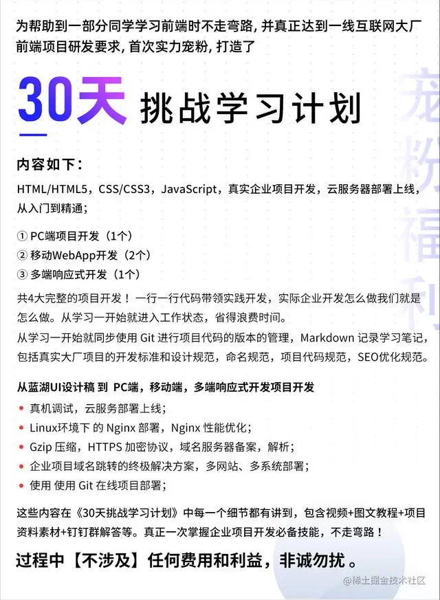 如果你才开始学习前端,那么可以先学习我们的三十天计划(零基础的同学报名系统班同学可以和老师沟通制定学习计划,可以得到更快的成长!)
