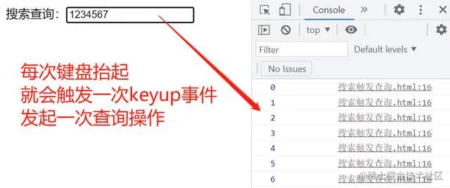 比如我们在一个表单中输入内容,JS通过监听输入框值的变化来查询搜索结果,我们会通过keyup事件来处理,当键盘弹起时就会触发keyup事件,在事件处理函数中发送请求处理查询结果。在我们输入内容时,会频繁的触发keyup事件,然而我们并不希望太频繁触发keyup事件处理函数发送请求查询。我们希望当我们抬起键盘间隔几百毫秒后再触发keyup事件处理函数发送请求查询(如果在间隔时间内再次触发keyup事件,就会把上一次的定时器清除,重新再计时)。因为频繁的触发增加了浏览器的性能消耗,同时也增加了对服务器的请求次数,增加服务器的压力。具体代码实现如下: