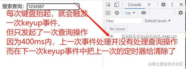 搜索查询:<input type="text" id="search" />每次键盘抬起都会触发keyup事件,但是keyup事件需要在400ms后才会处理查询操作,所以在下次触发keyup时,时间在400ms内,就会把上一次的定时器给清除了,本质上就没有触发查询操作。所以在所有电话号码输入完成后,400ms后就触发了一次查询操作。这样做的好处减少事件回调执行,提高浏览器性能。