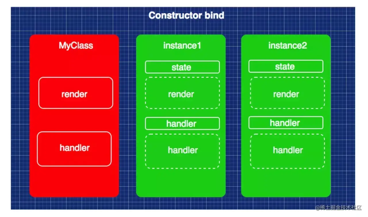 注: 图中,虚线框面积代表引用函数所节省的内存,实线框的面积代表消耗的内存。 图一:使用箭头函数做this绑定。只有render函数定义在原型对象上,由所有实例对象共享。其他内存消耗都是基于每个实例上的。 图二:在构造函数中做this绑定。render,handler都定义在原型对象上,实例上的handler实线框代表使用bind生成的函数所消耗的内存大小。
