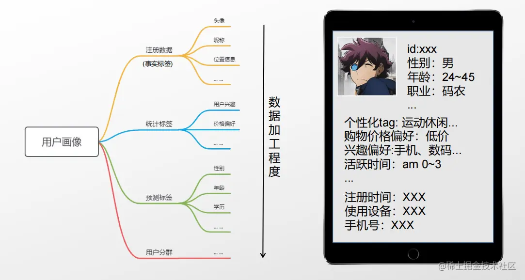 - 必须从业务场景出发,解决实际的业务问题,之所以进行用户画像要么是获取新用户,或者是提升用户体验,或者是挽回流失用户等有明确的业务目标。