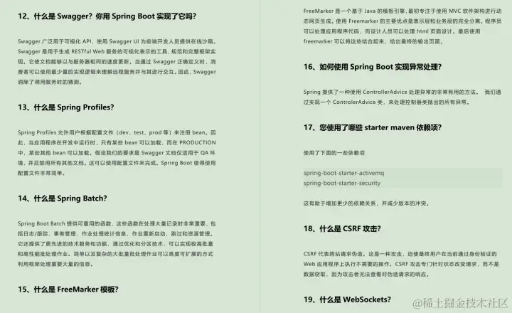 内容涵盖:Java、MyBatis、ZooKeeper、Dubbo、Elasticsearch、Memcached、Redis、MySQL、Spring、Spring Boot、Spring Cloud、RabbitMQ、Kafka、Linux 等技术栈,下面将这份手册展示给大家: