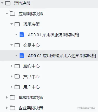基于对跨应用架构决策的存储,团队选择将ADR存储在在线协同文档平台,并通过合理的文件夹结构进行组织,参考以下组织形式: