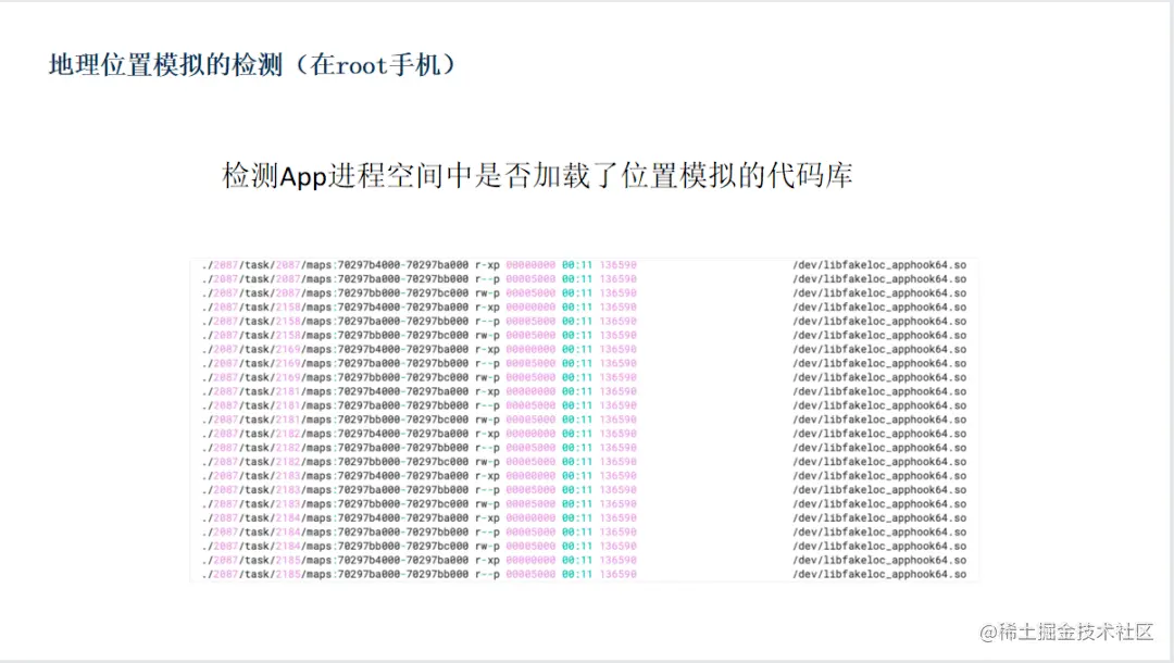 **一种是通过检测文件系统中是否存在位置模拟的代码库。**以下图为例,可以看到,模拟位置的代码库通过共享代码注入到代码里。一般情况下,我们可以通过检测整体的进程空间,在进程空间里,如果发现了这部分so 文件存在,那么也就说明这部分文件被注入到了内存里,由此也可以判断出当前App 所获得的代码信息及位置信息。