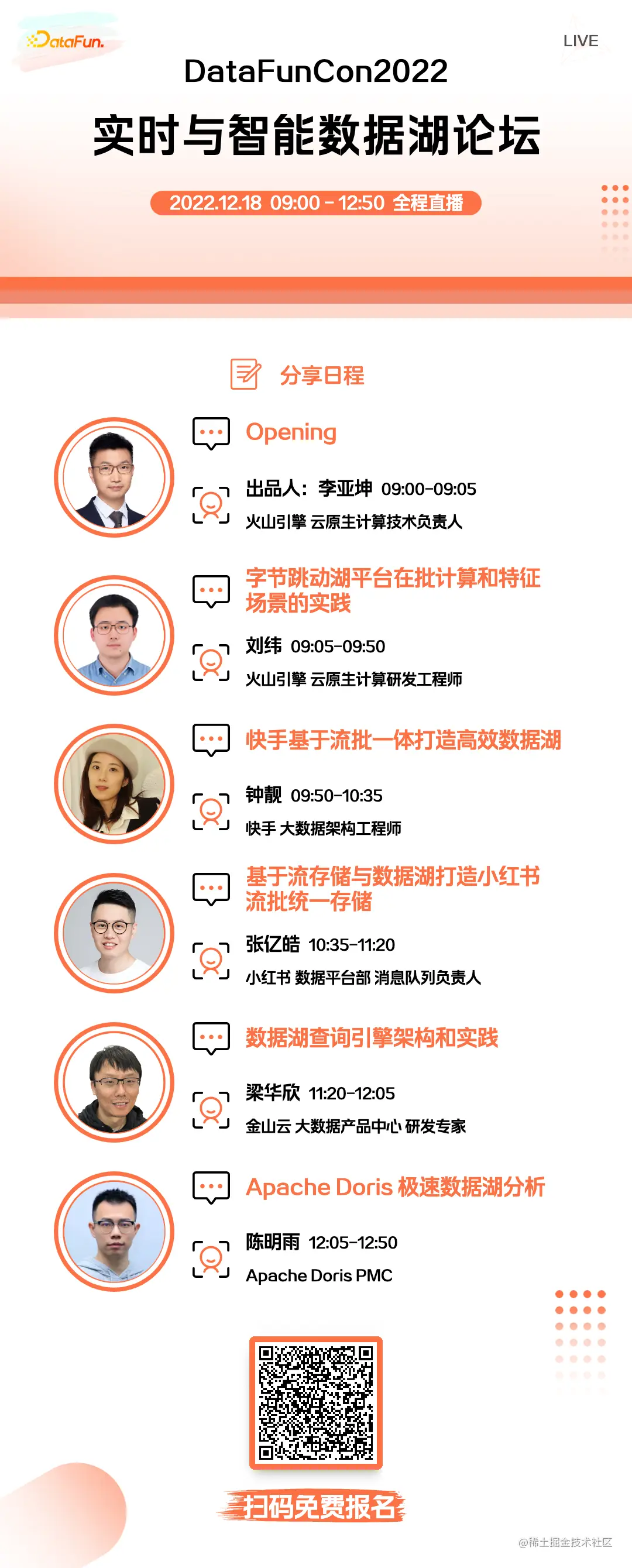 2022年12月18日 9:00-12:50,由火山引擎云原生计算技术负责人李亚坤出品的 DataFunCon 2022 大会 「实时与智能数据湖」专场 全程直播,欢迎准时收看!