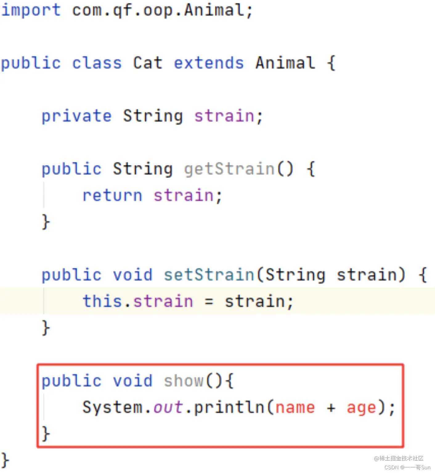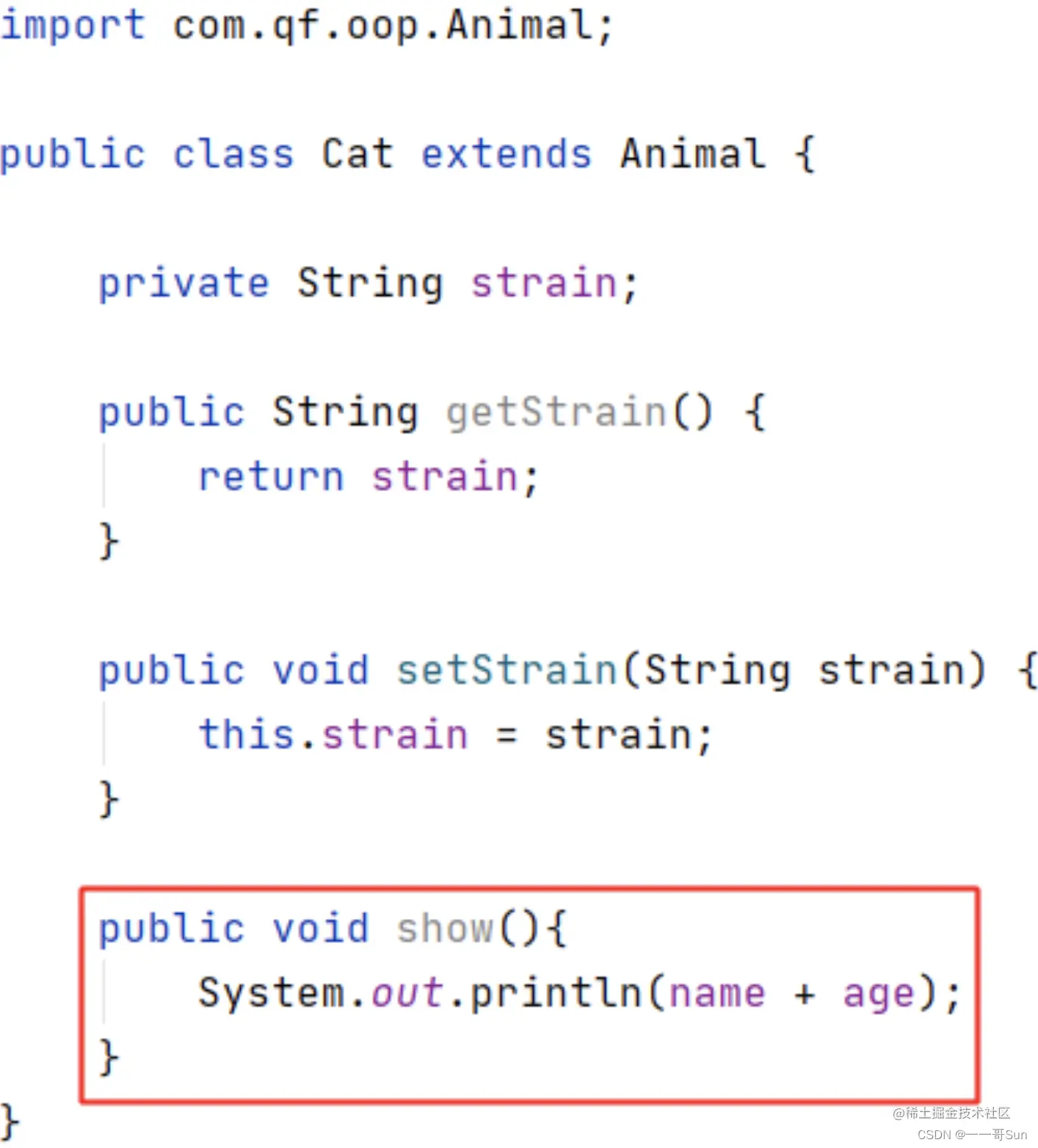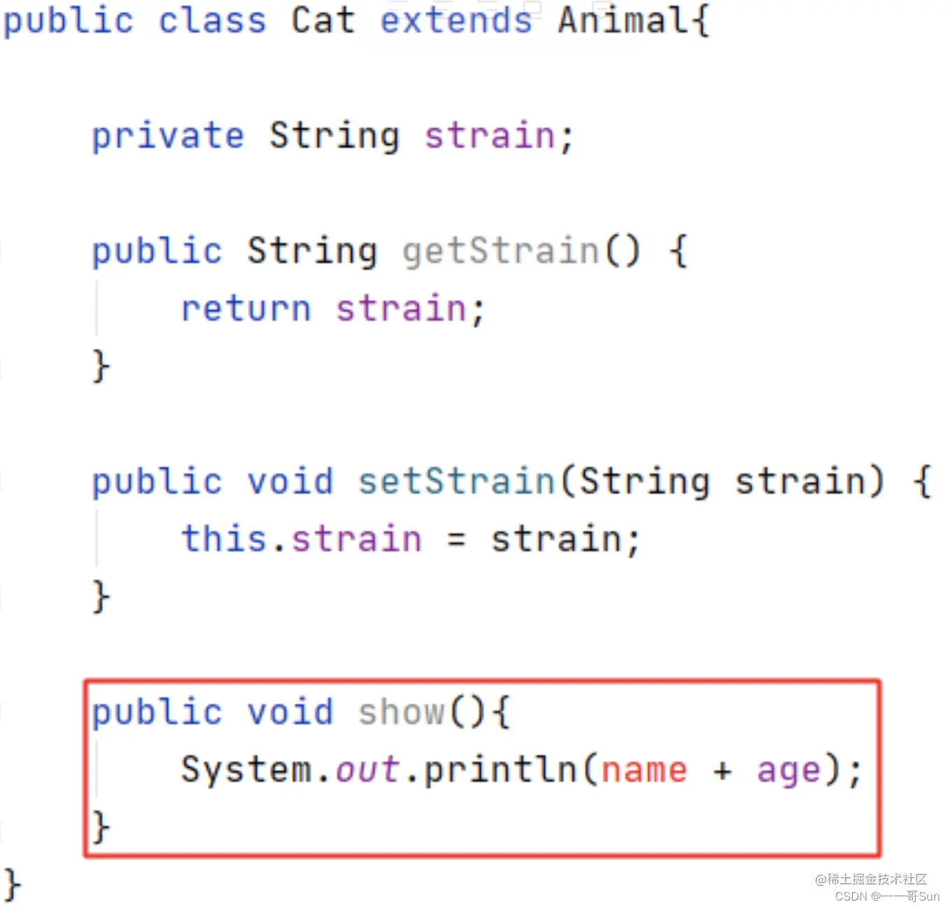 子类 Cat 中的 eat 方法与父类 Animal 中的 eat 方法具有相同的签名和返回值类型,这样的方法我们称其为重写了父类中eat 方法。