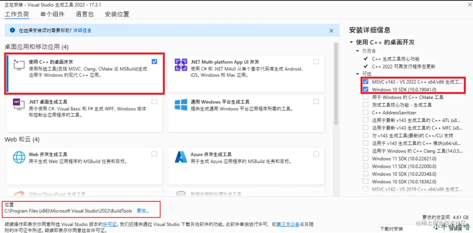 我们需要安装 Microsoft C++ 生成工具。 其实最简单的方法是下载 Visual Studio 2022 生成工具。 进行安装选择时,请勾选 "C++ 生成工具" 和 Windows 10 SDK。
