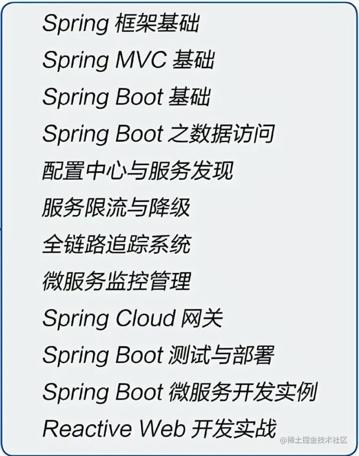目录总共分为12章,Spring 框架基础、Spring MVC基础和 Spring Boot 基础都是针对初学者的,主要起到一个前置知识的作用,不同水平的小伙伴完全可以根据自己的情况来选择对应的章节进行学习