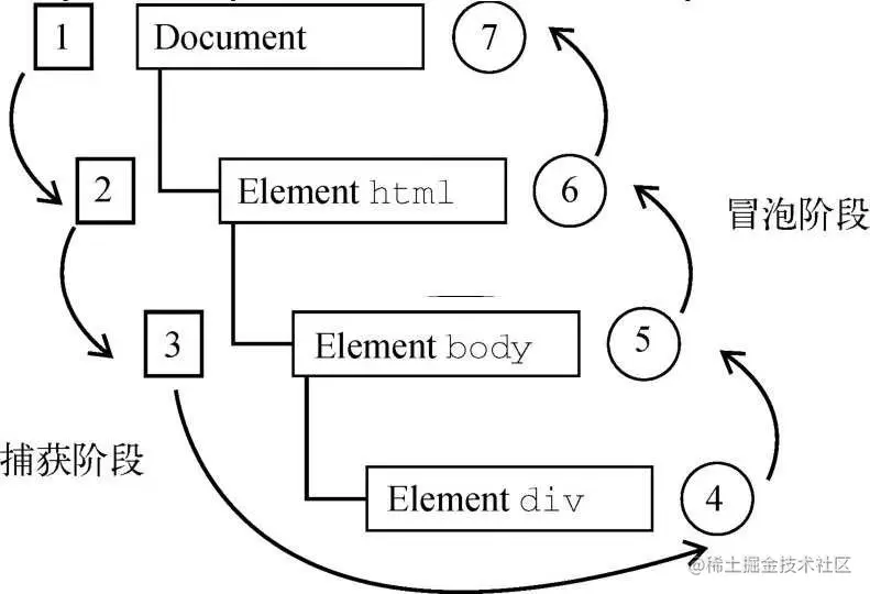 事件捕获:事件由最不具体的元素逐级向下传递到最具体的元素。