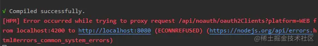 我们会发现虽然编译成功了,但是会报一个错,这是由于我们的后台服务没有启动。我们需要在proxy.conf.js文件中配置我们的后台服务路径,一般会由后台人员搭建好,直接使用搭建好的路径,再次执行编译命令即可。