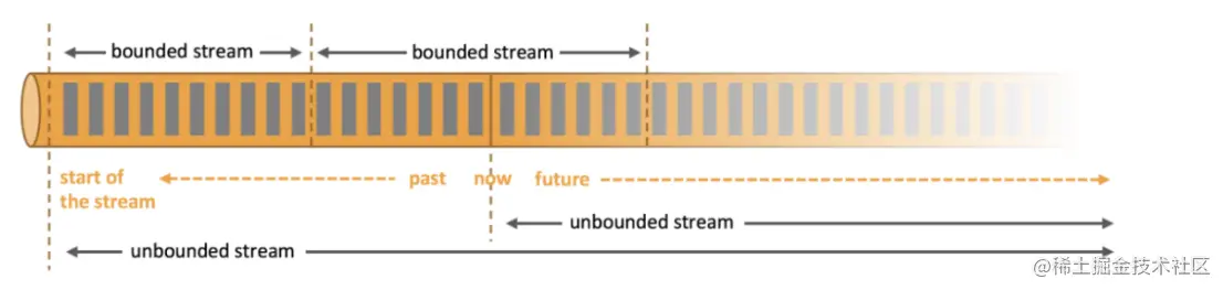 由上图可以看出 bounded stream(有界)数据流是有起点和结束点的,而 unbounded stream(无界)只有 start of the stream(数据起点)并没有看到结束点。所以窗口计算就可以看成是无界的数据流切割为有界流的一种方式,它会将流数据分发到有限大小的桶(bucket)中进行分析。