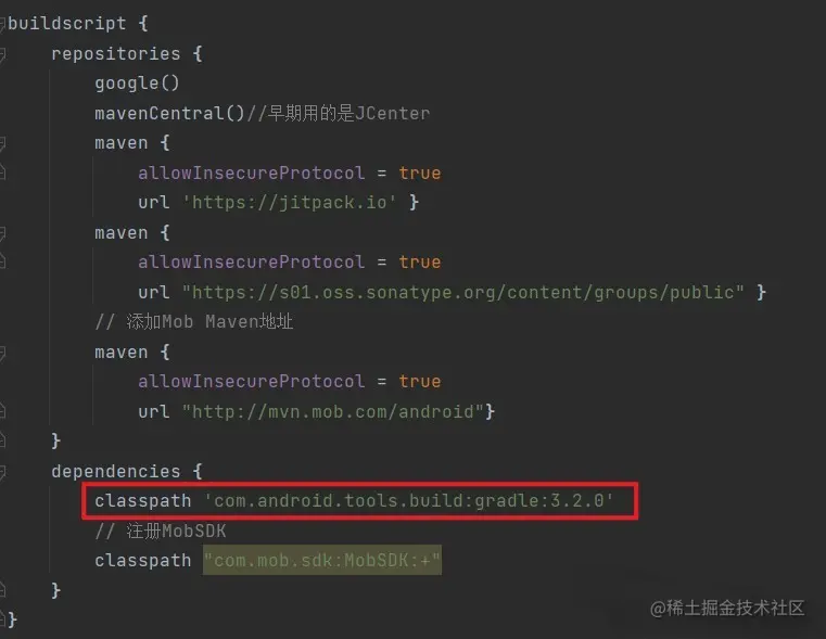 maven { allowInsecureProtocol = true //加这个是为了避免mob被判定为不安全的协议而无法引入url "mvn.mob.com/android"}