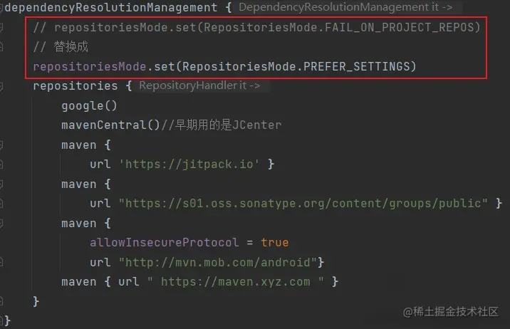 在新版中settings.gradle配置中默认设置依赖模式为FAIL_ON_PROJECT_REPOS,导致直接或通过插件声明的任何存储库都将会触发构建错误,故我们将其替换成 repositoriesMode.set(RepositoriesMode.PREFER_SETTINGS)