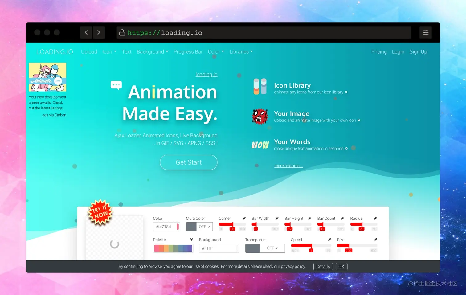 Loading.io 是一个简单好用的 Loader/Spinner 制作网站,并生成相应的 CSS 代码。它提供了丰富的样例库给你选择,同时还允许你自己上传一个图标然后帮你制作一个新的 Loader。它还提供了质量较高的一些付费选项,但对于大多数用户来说免费的就足够了。