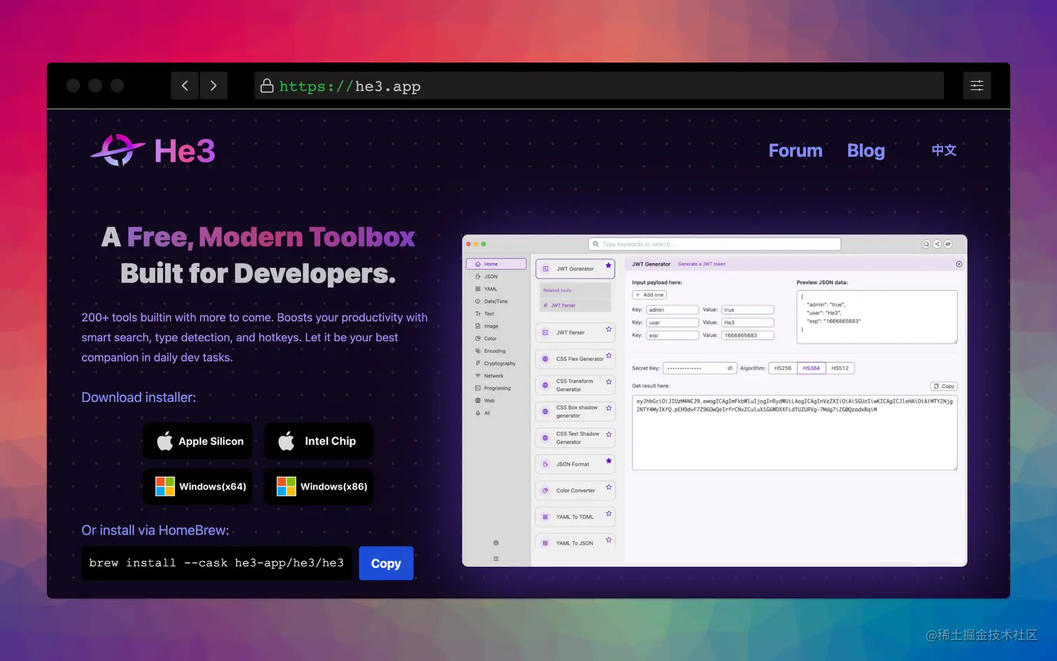 He3.App 是开发者的终极利器。它汇集了日常开发中所需要的各种 JSON、YAML、Web、哈希等方面的小工具,让你随时随地都能轻松找到所需。此外,它还提供了一些极具开发者特色的功能,例如个性化主页、搜索框、剪切板自动识别、实时计算等。对于开发者而言,它简直就是一个宝藏般的神器。