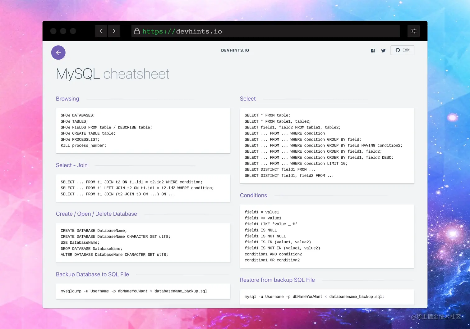 你是否有过想要速查某种工具用法的经历?今天就有这么一款工具叫 Devhints.io 汇集了多种技术工具的速查表。用上之后,你能够很轻松地在上面找到某类工具具体的快捷命令与基础语法。