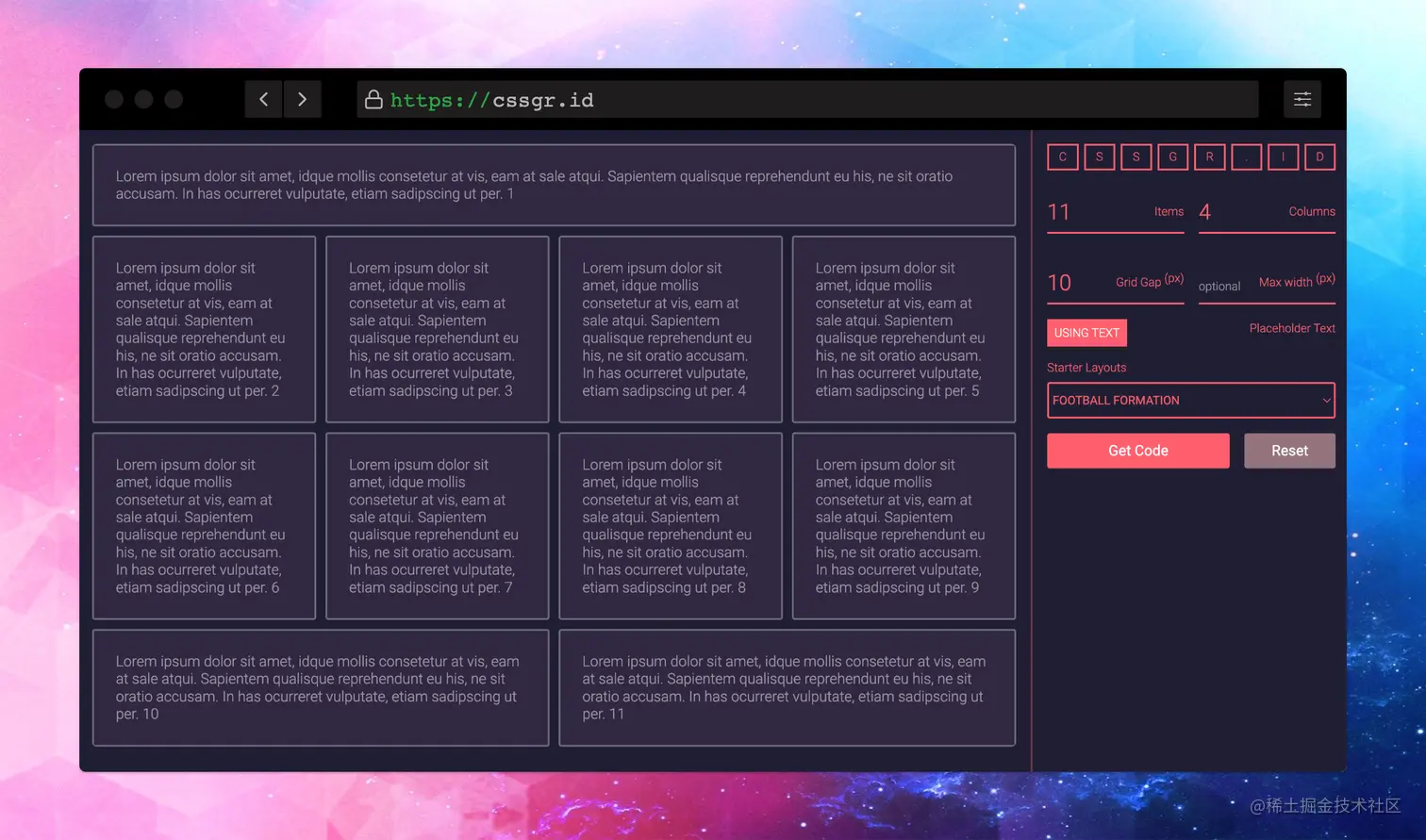cssgr.id 是一个能让你用简单的交互方式来进行 CSS Grid 布局的网站。你可以在它上面设置宽距、填充示例内容、以及生成相应的 HTML 和 CSS 源码。