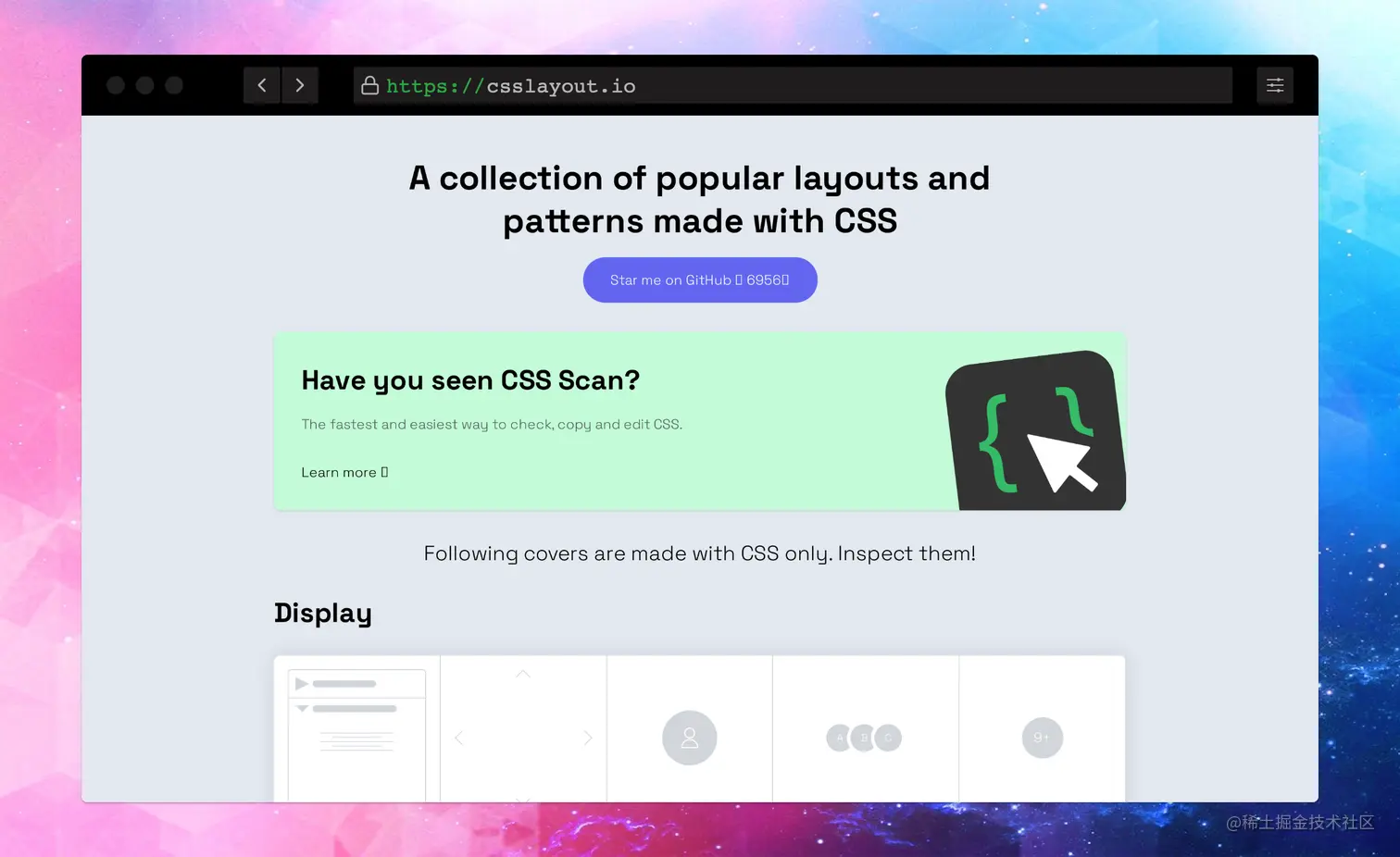 csslayout.io 是一个为前端开发者提供现代 CSS 布局样例的在线平台。它汇集了众多实用的由 CSS 组合而成的布局样例,前端开发者可以直接 Copy 或者组合它们,去实现工作中需要的各种布局。此外,该网站还提供了详细的代码和在线 demo,能够让你更容易理解和更快上手。