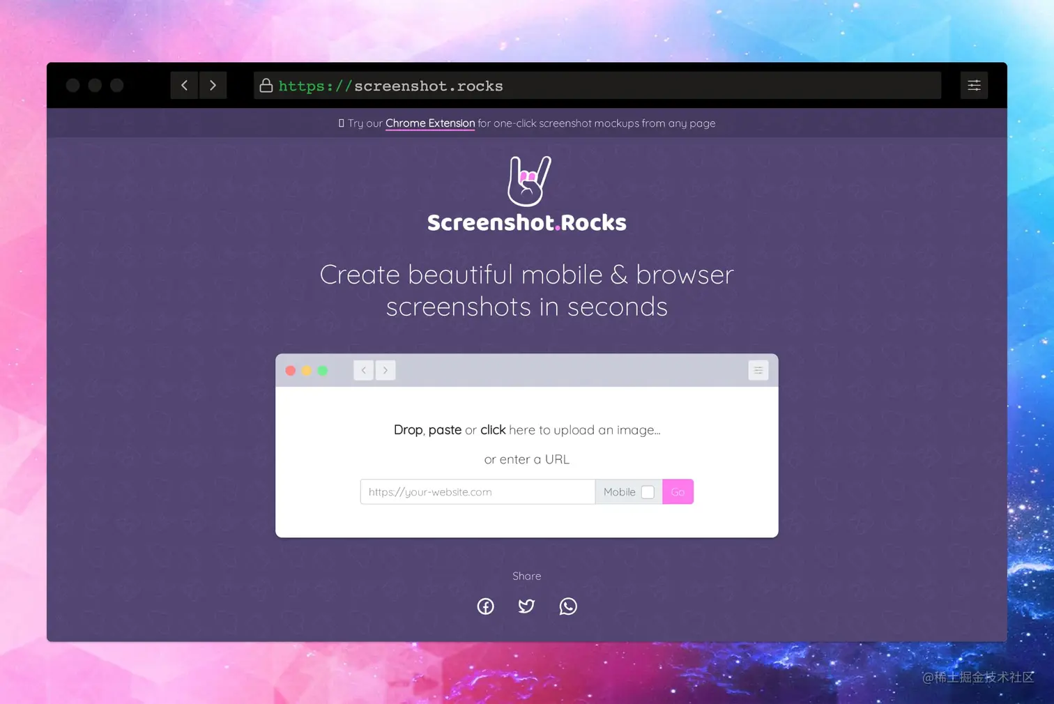 Screenshot Rock 是一个可以创建漂亮截图的工具。您只需要上传任何屏幕截图,它就会为你提供浏览器或移动端界面来打造一个 mockup,并提供精美的背景图案。下面这个截图就是使用它自己制作的: