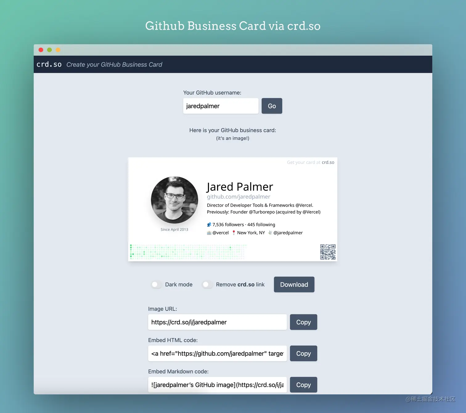 今天有一个网站 crd.so 能自动通过你的 Github 用户名制作一份精美的名片。名片是社交中不可或缺的一部分。对于程序员来说 Github 是最能彰显他们身份的象征,也是最长更新个人信息的地方。