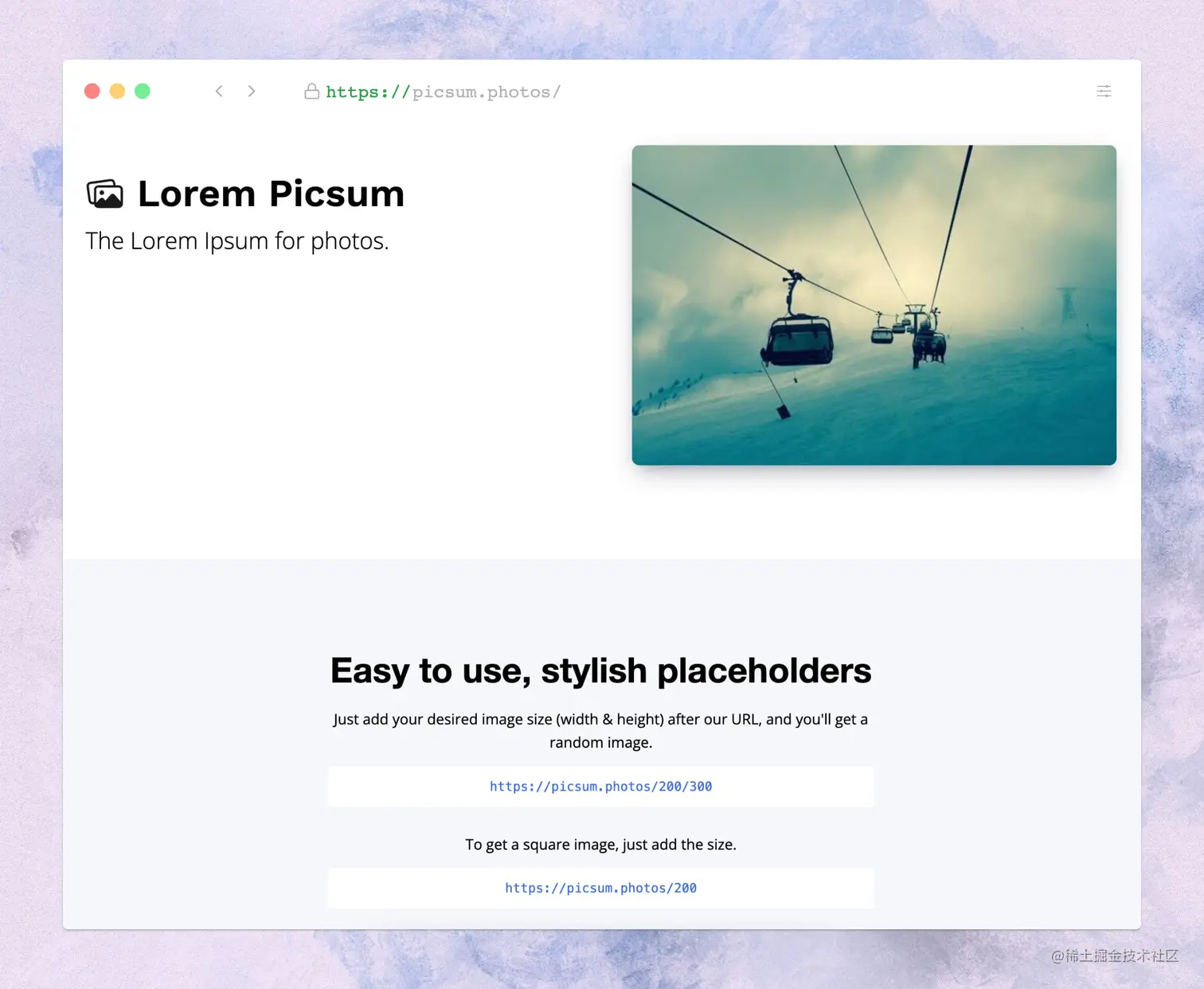 Picsum.photos 是一个给用户提供接口来获取图片的服务。在开发网页中我们常常需要放入图片来进行测试。借助这个服务,就可以在 <img> 标签的 src 中引入根据它的规则制定的 URL,从而获得一个随机图片。此外,它还提供了一系列参数如高度宽度、模糊度、灰度等,让你可以更精确地生成想要的图片。