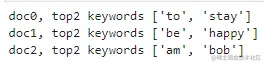 print("doc{}, top{} keywords {}".format(c, n, [i2v[i] for i in idx]))