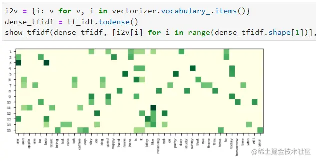 然后就能计算文档中的 了,像上篇博文 【NLP】入门(四):TF-IDF(代码篇) 中 IDF 计算一样,也可以使用下面的 vectorizer._idf 来提取,用来给新的数据使用。