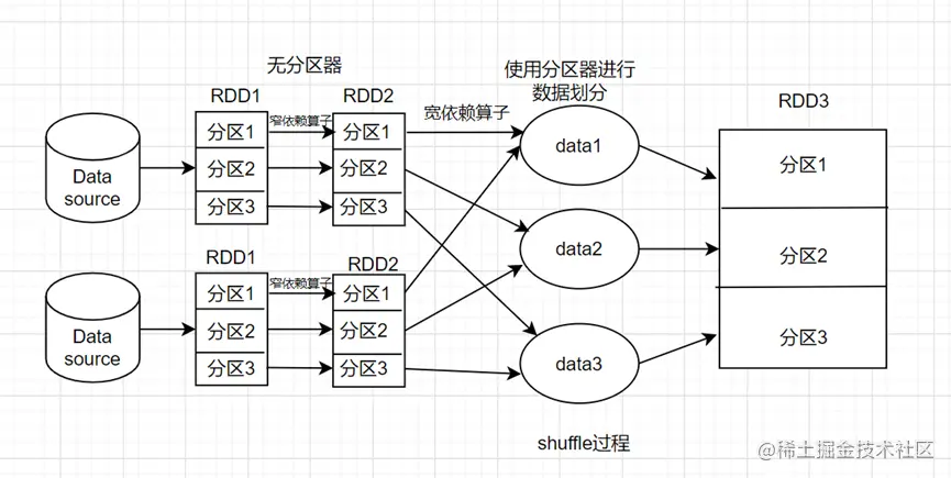 (1) 源头 RDD 的分区数是由数据源的读取器机制内部决定的,而且通常没有分区器;