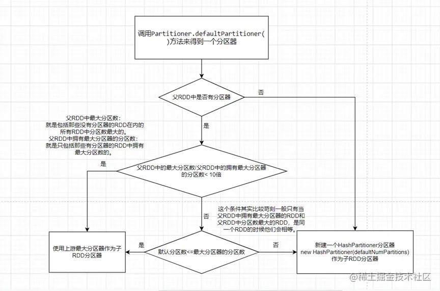 源码中之所以这样设计,是为了在调用 shuffle 算子的时候在开发人员没有指定分区器和分区数的情况下,尽量使用父 RDD 中的分区器,而且如此设计也能保证上下游的分区数过渡平稳,即上游 RDD 的分区数不大于下游分区数的十倍,因为每一个分区的数据将来都对应一个 task 去处理,如果下游分区数少于上游太多的话,下游 task 数量就会太少,每一份 task 要处理的数据就会过多,这样就很容易导致某个 Executor 内存溢出,也会拖慢整个任务处理速度。