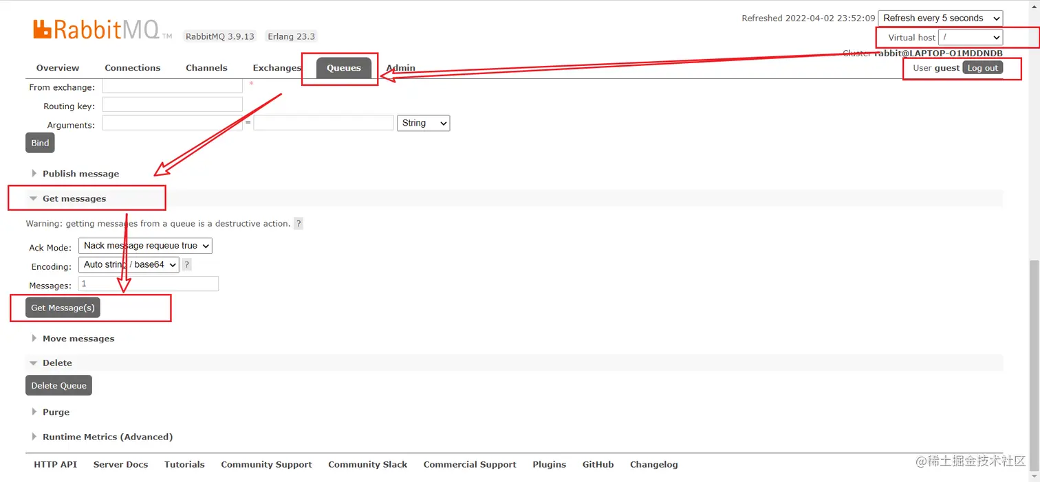 登录guest(配置的那个账户).查看对应的虚拟机(配置的那个虚拟机),查看队列以及发送的消息